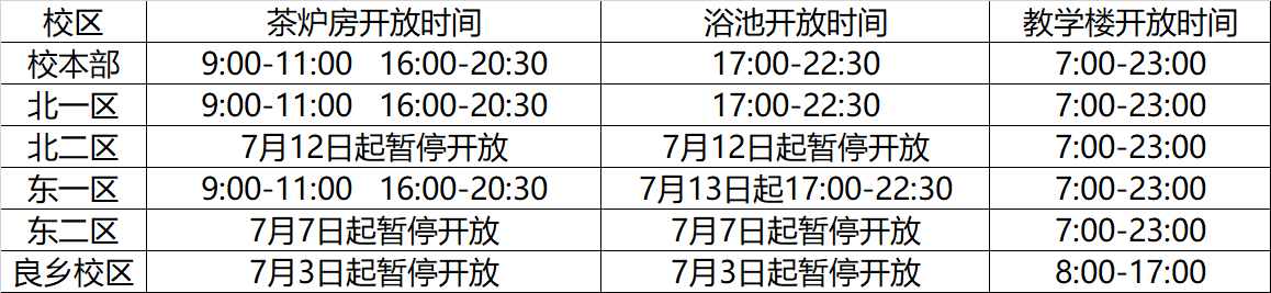 各校区学生公寓7月5日至9月10日执行以上安排,9月11日恢复正常。